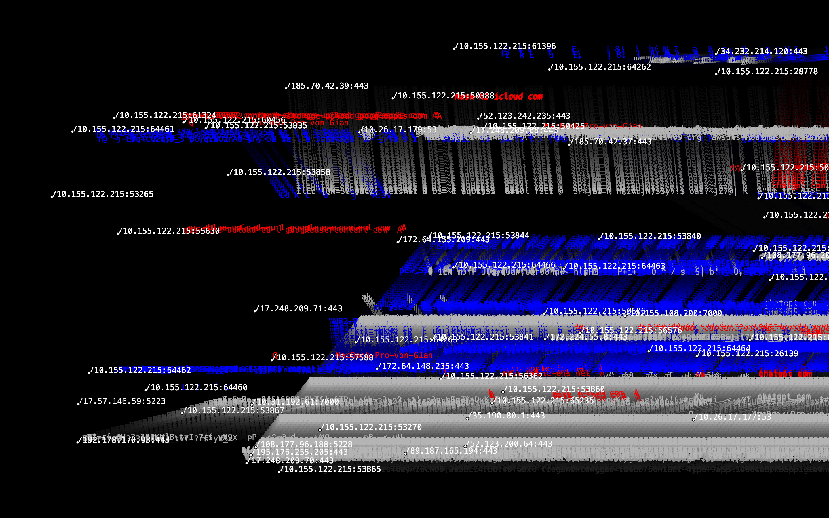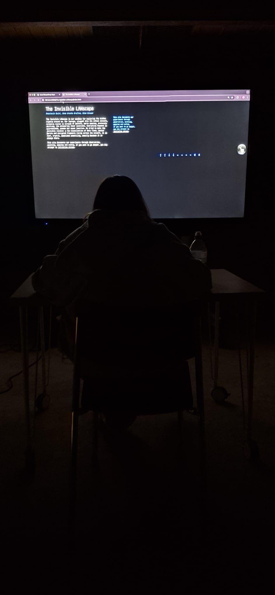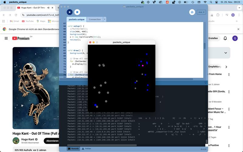 The Invisible LANscape is our sandbox for exploring the hidden signals around us. Our laptops, plugged into the school network, silently listen to streams of packets, ports opening, protocols shifting, IPs whispering their locations. Everything happens in microseconds, unseen but never inactive. We tried to make the invisible visible: a raw visualization of data flows, packet bursts and encrypted fragments racing across the network. It is fast, cryptic, sometimes unsettling, exactly because it is always there.