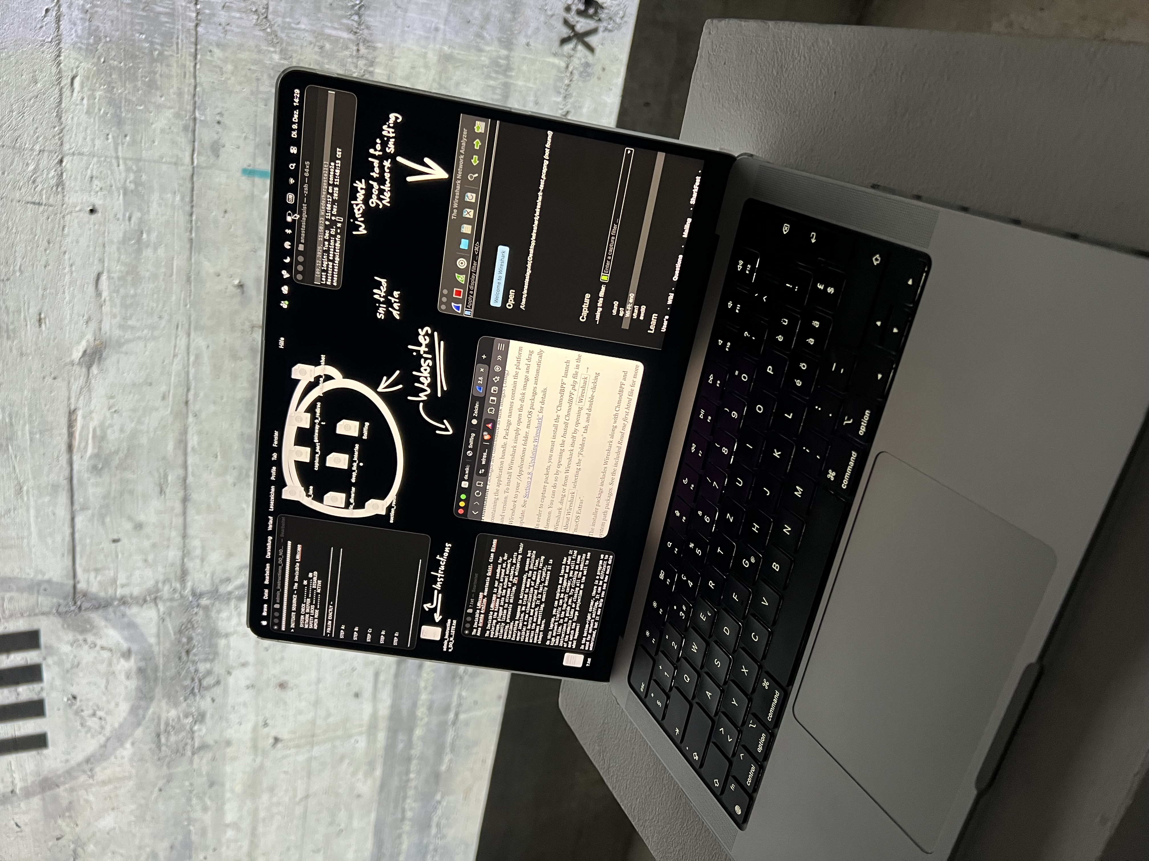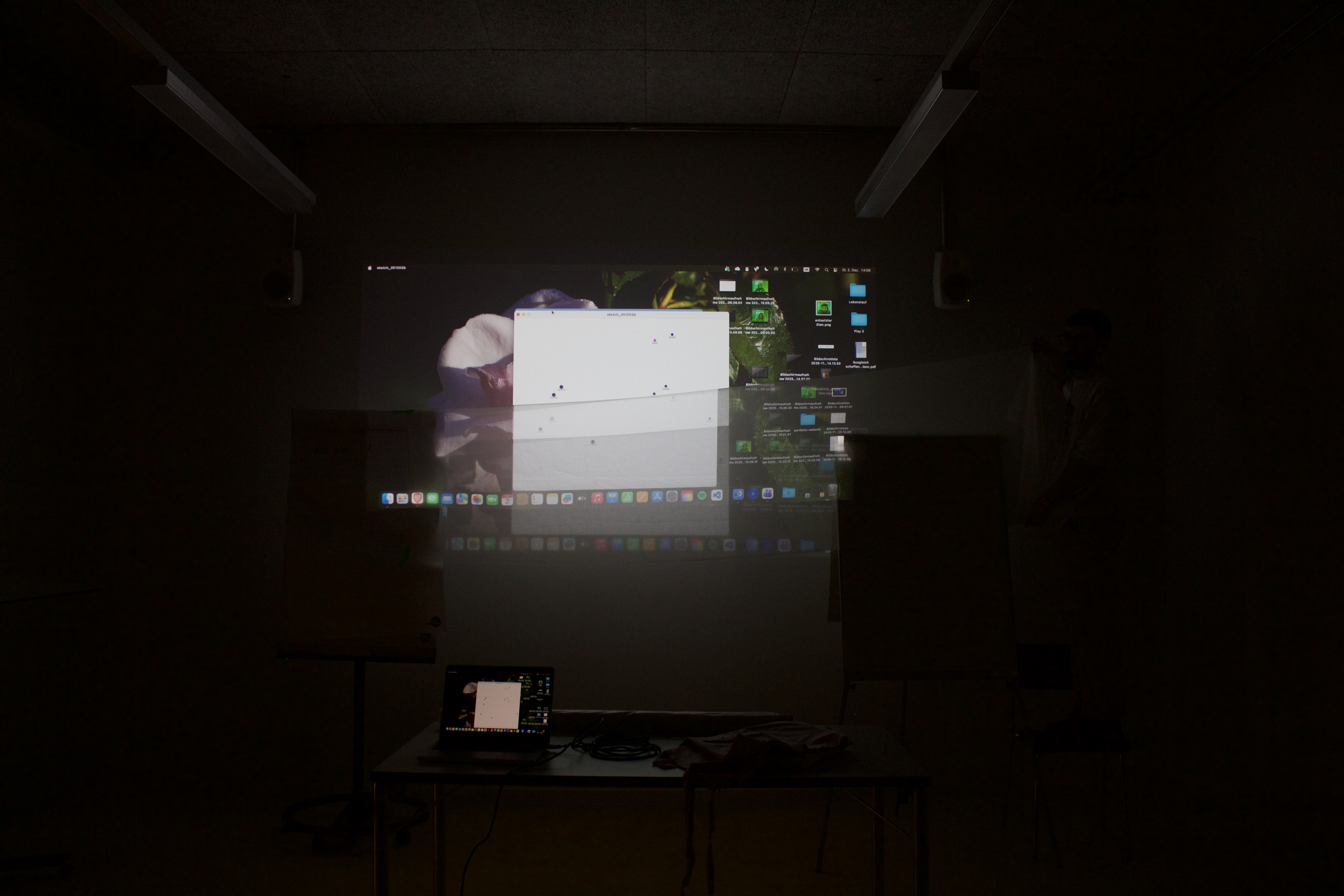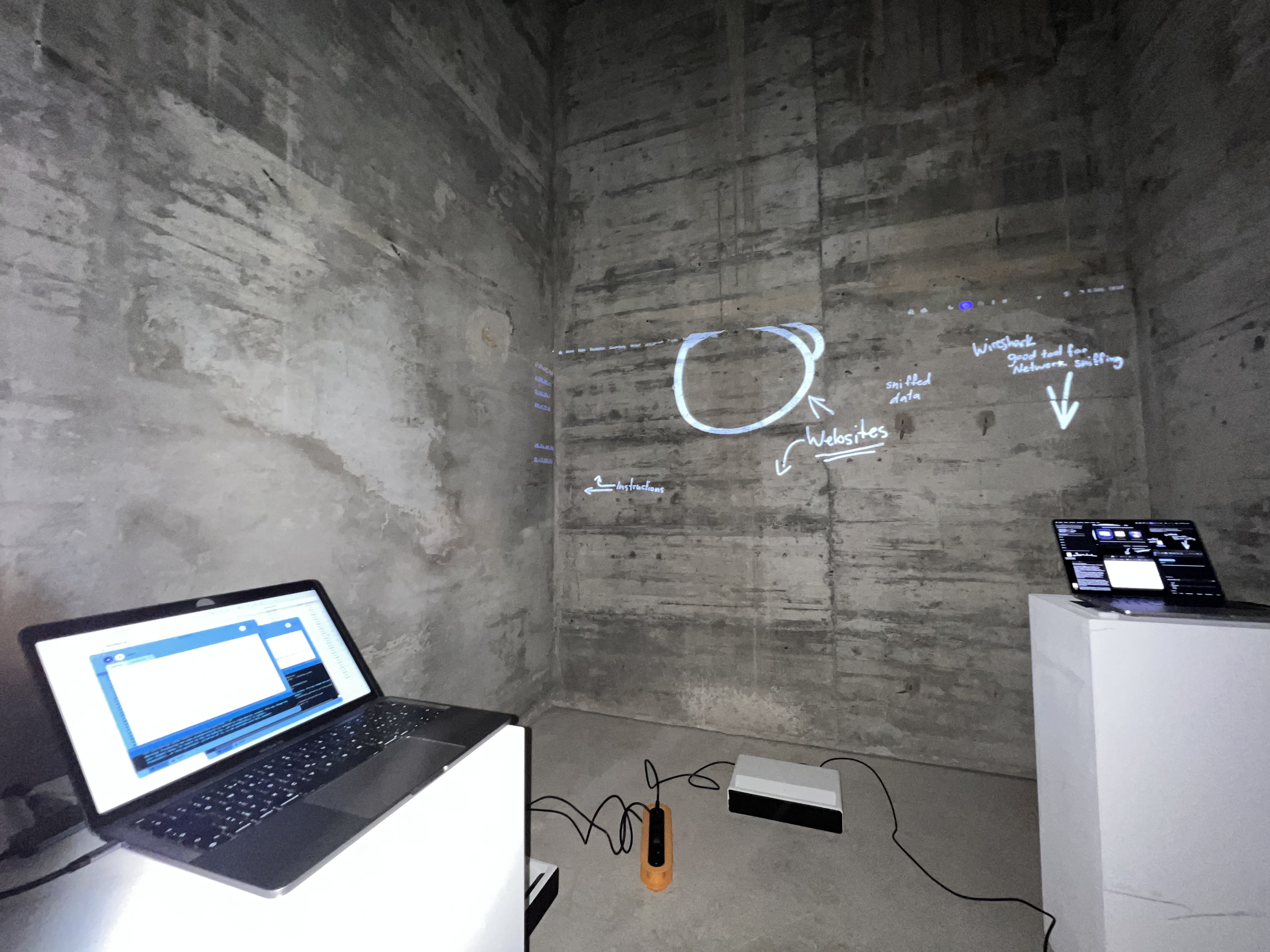 The Invisible LANscape is our sandbox for exploring the hidden signals around us. Our laptops, plugged into the school network, silently listen to streams of packets, ports opening, protocols shifting, IPs whispering their locations. Everything happens in microseconds, unseen but never inactive. We tried to make the invisible visible: a raw visualization of data flows, packet bursts and encrypted fragments racing across the network. It is fast, cryptic, sometimes unsettling, exactly because it is always there.