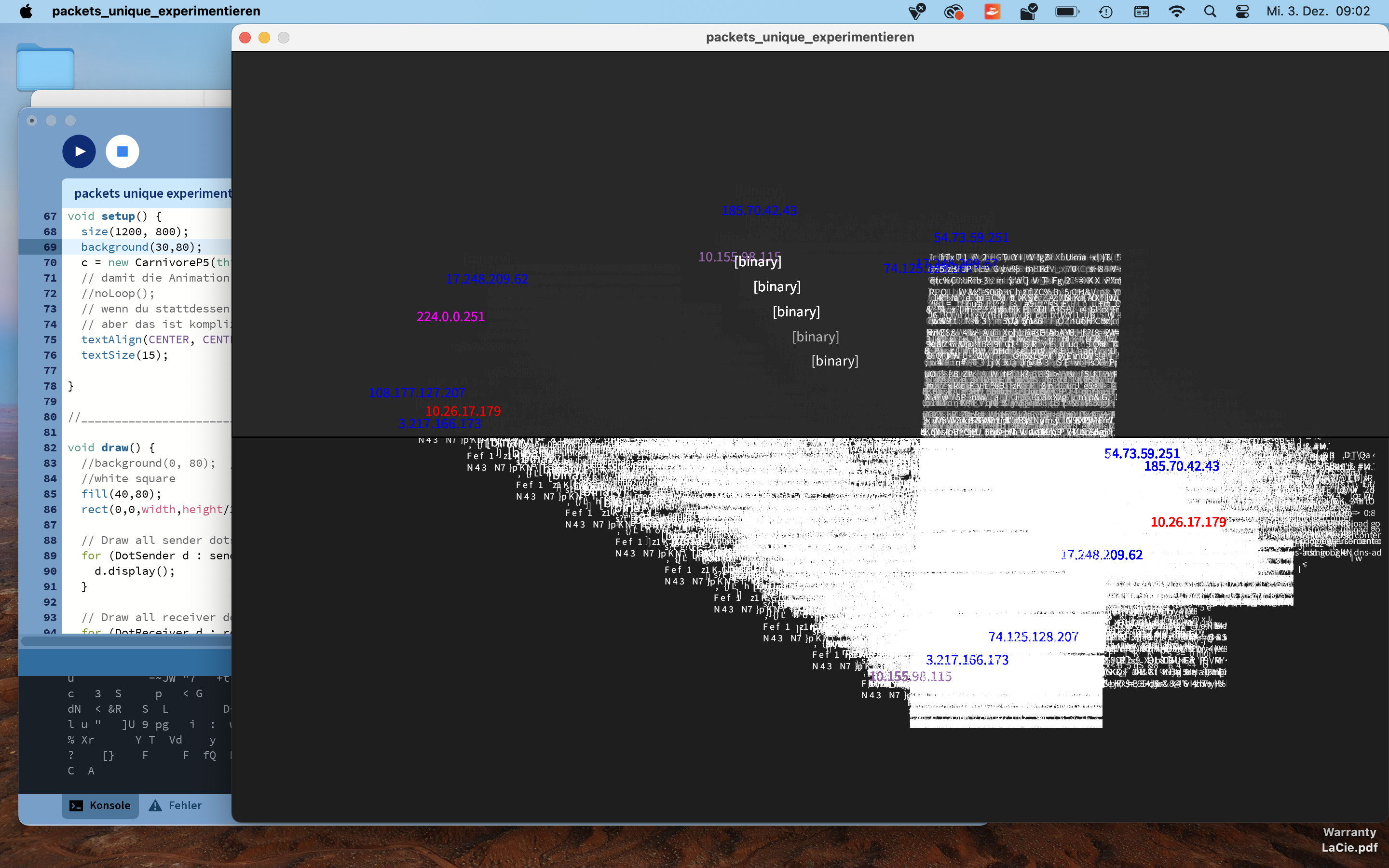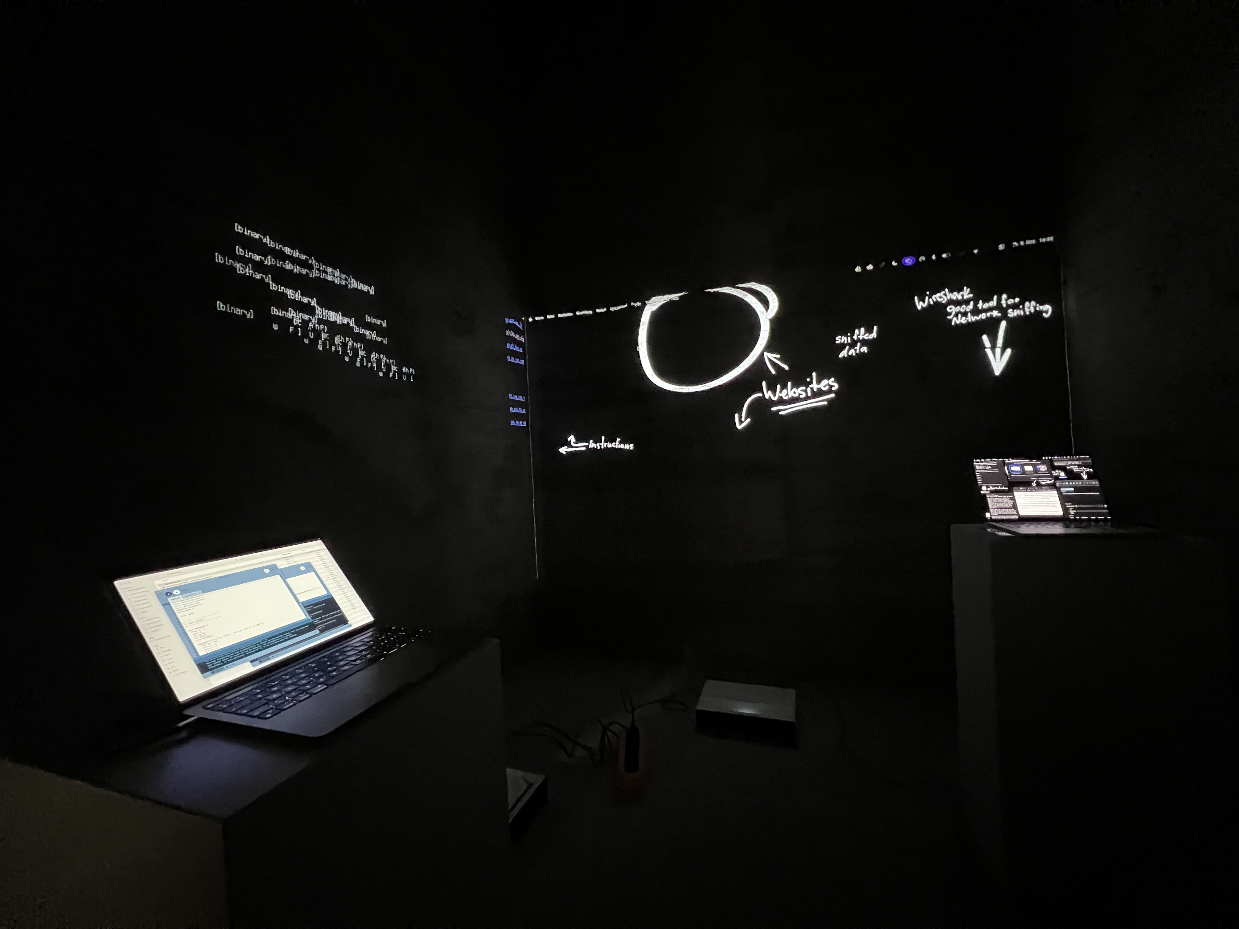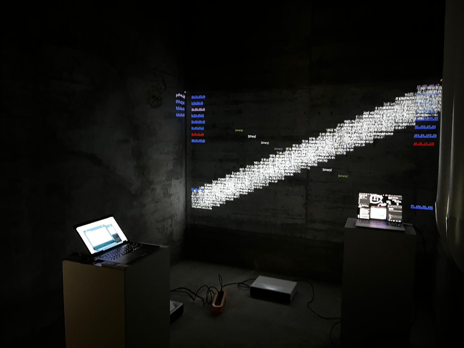 The Invisible LANscape is our sandbox for exploring the hidden signals around us. Our laptops, plugged into the school network, silently listen to streams of packets, ports opening, protocols shifting, IPs whispering their locations. Everything happens in microseconds, unseen but never inactive. We tried to make the invisible visible: a raw visualization of data flows, packet bursts and encrypted fragments racing across the network. It is fast, cryptic, sometimes unsettling, exactly because it is always there.