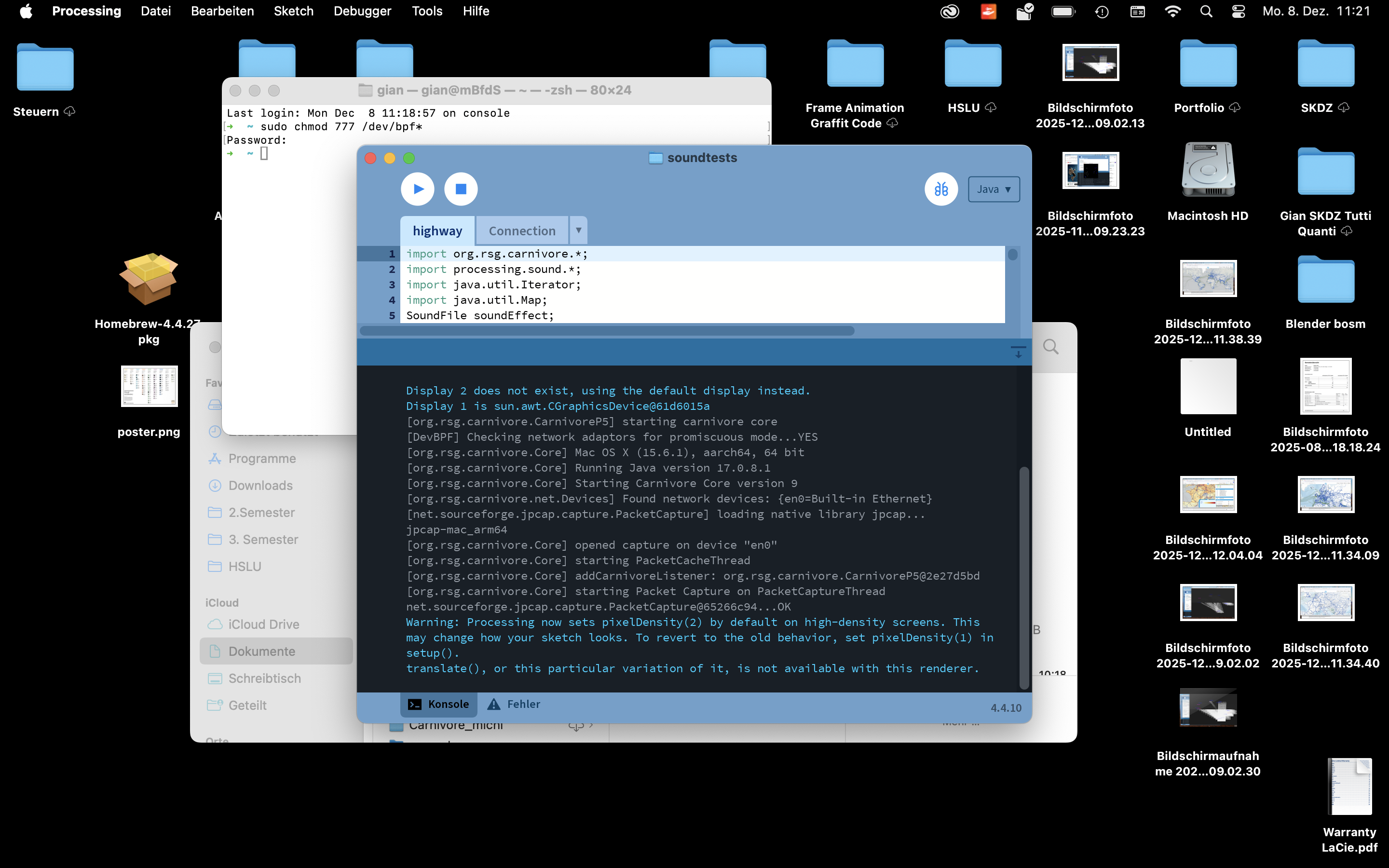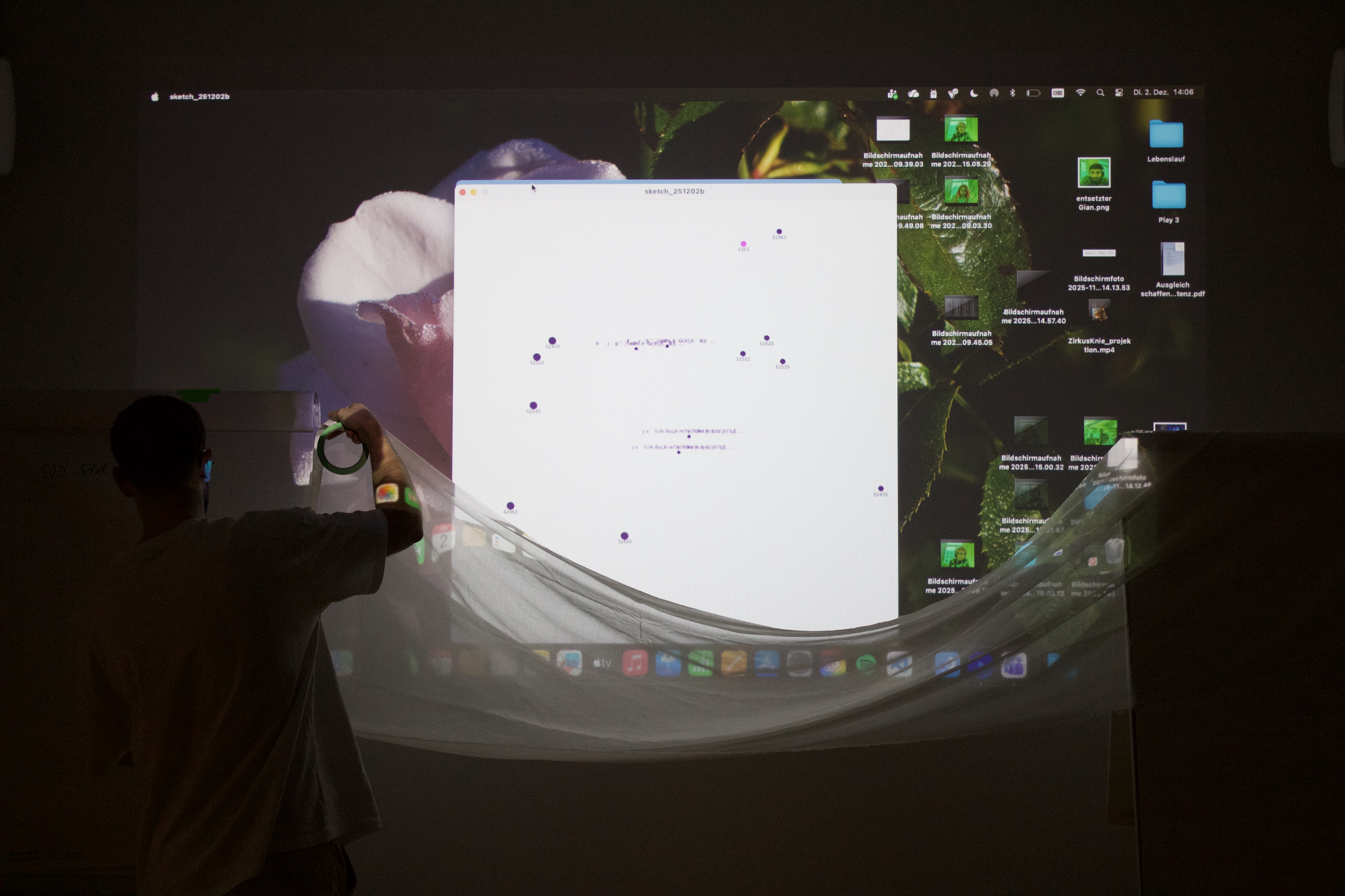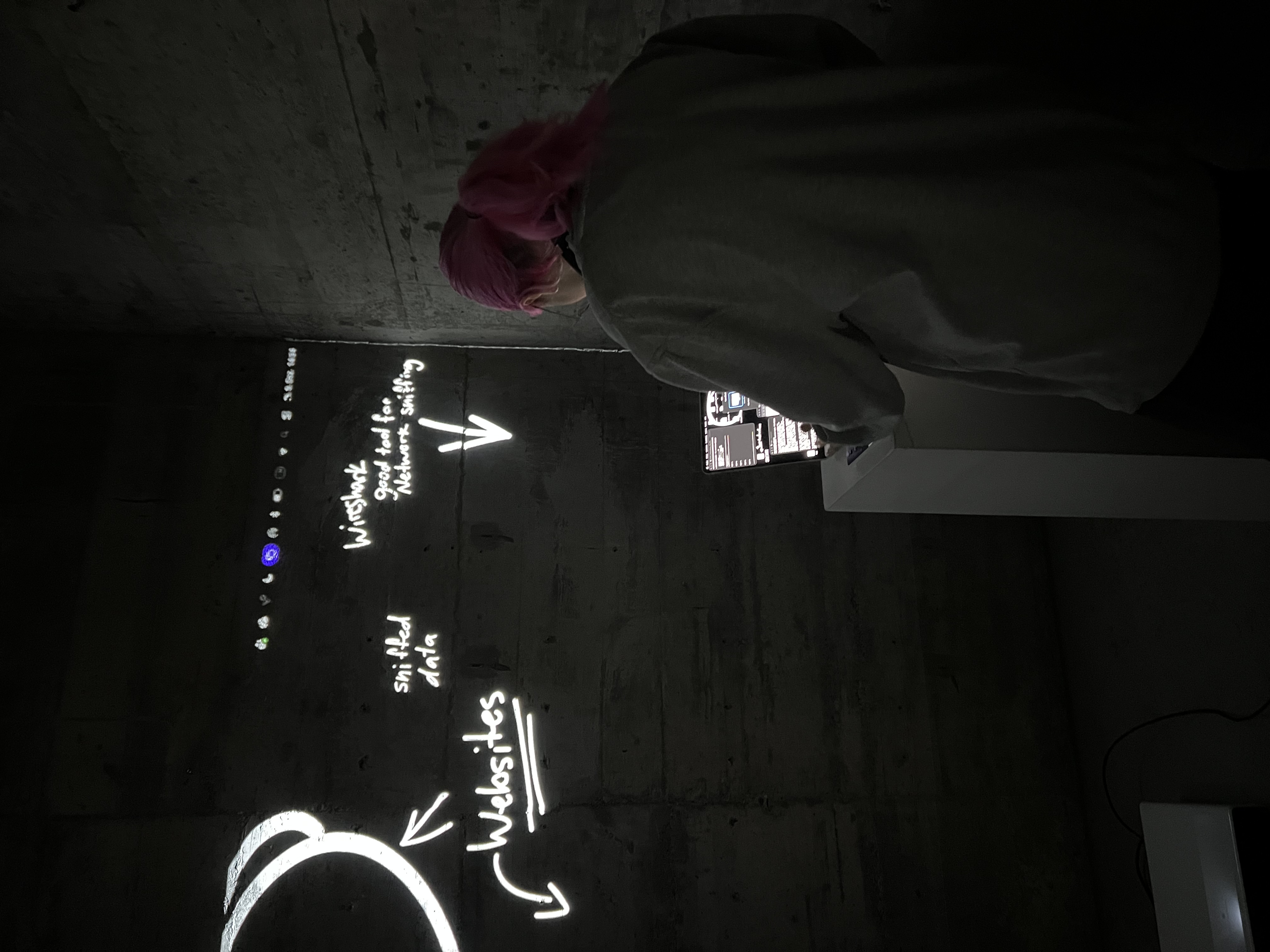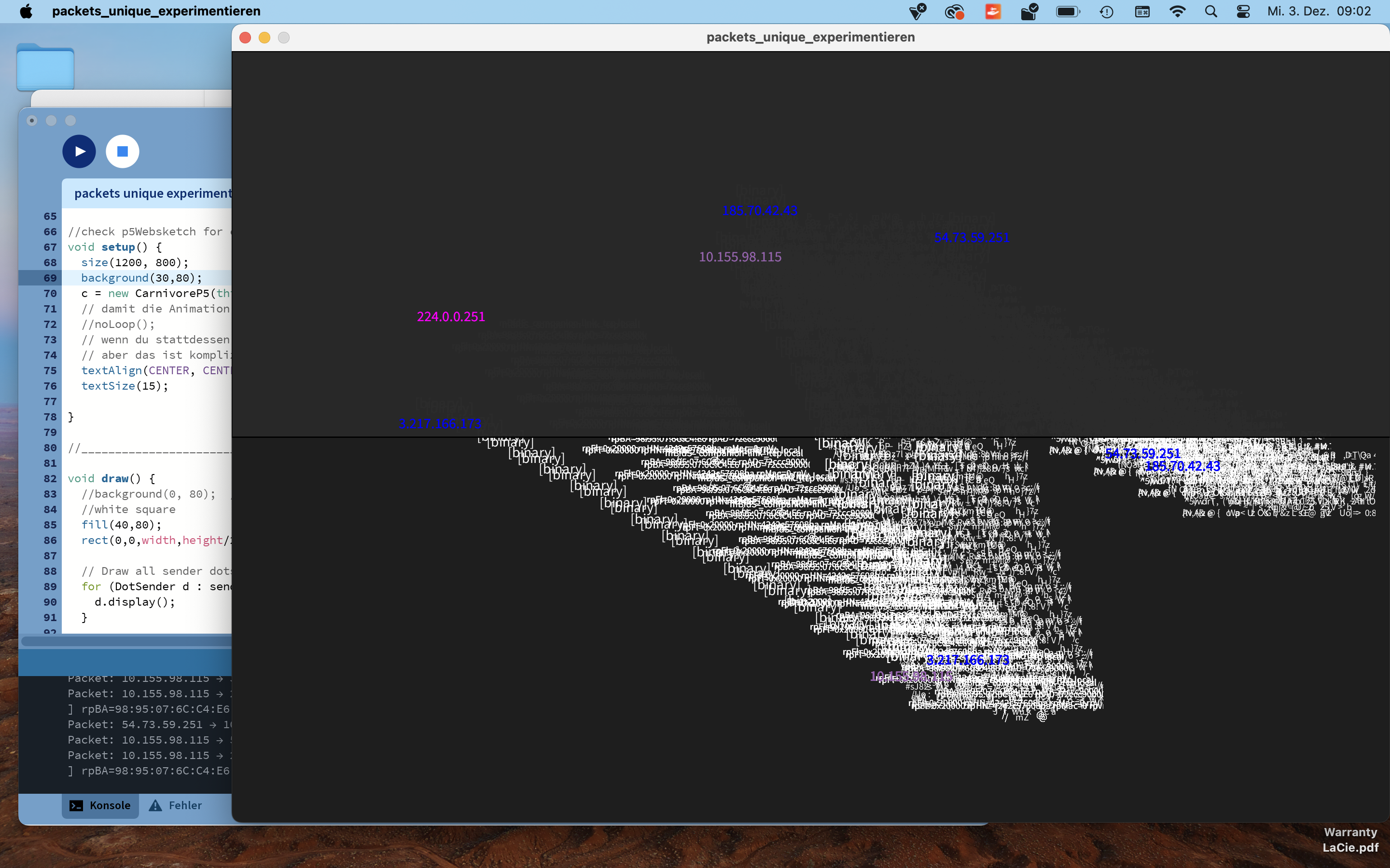 The Invisible LANscape is our sandbox for exploring the hidden signals around us. Our laptops, plugged into the school network, silently listen to streams of packets, ports opening, protocols shifting, IPs whispering their locations. Everything happens in microseconds, unseen but never inactive. We tried to make the invisible visible: a raw visualization of data flows, packet bursts and encrypted fragments racing across the network. It is fast, cryptic, sometimes unsettling, exactly because it is always there.